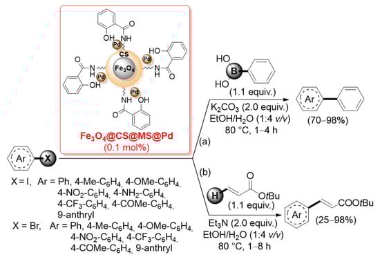 - Hasan, K. Methyl Salicylate Functionalized Magnetic Chitosan Immobilized Palladium Nanoparticles: An Efficient Catalyst for the Suzuki and Heck Coupling Reactions in Water. ChemistrySelect 2020, 5, 7129–7140. [Google Scholar] [CrossRef]
