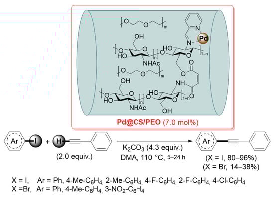 - Zhong, S. Incorporation of Palladium Catalyst Inside Cross-Linked Chitosan Hybrid Nanofibers for the Sonogashira Reaction. Kinet. Catal. 2020, 61, 480–485. [Google Scholar] [CrossRef]