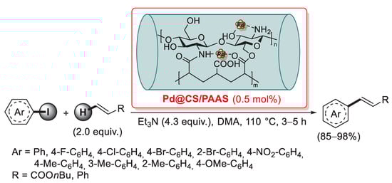 - Du, Y.; Wei, S.; Tang, M.; Ye, M.; Tao, H.; Qi, C.; Shao, L. Palladium nanoparticles stabilized by chitosan/PAAS nanofibers: A highly stable catalyst for Heck reaction. Appl. Organomet. Chem. 2020, 34, e5619. [Google Scholar] [CrossRef]