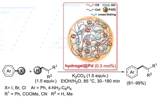 - Ashiri, S.; Mehdipour, E. Preparation of a novel palladium catalytic hydrogel based on graphene oxide/chitosan NPs and cellulose nanowhiskers. RSC Adv. 2018, 8, 32877–32885. [Google Scholar] [CrossRef] [PubMed]