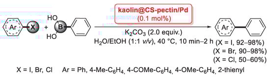 - Shahriari, M.; Ali Hosseini Sedigh, M.; Shahriari, M.; Stenzel, M.; Mahdi Zangeneh, M.; Zangeneh, A.; Mahdavi, B.; Asadnia, M.; Gholami, J.; Karmakar, B.; et al. Palladium nanoparticles decorated Chitosan-Pectin modified Kaolin: It’s catalytic activity for Suzuki-Miyaura coupling reaction, reduction of the 4-nitrophenol, and treatment of lung cancer. Inorg. Chem. Commun. 2022, 141, 109523. [Google Scholar] [CrossRef]