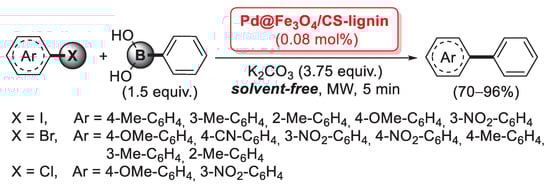 - Baran, T.; Sargin, I. Green synthesis of a palladium nanocatalyst anchored on magnetic lignin-chitosan beads for synthesis of biaryls and aryl halide cyanation. Int. J. Biol. Macromol. 2020, 155, 814–822. [Google Scholar] [CrossRef] [PubMed]