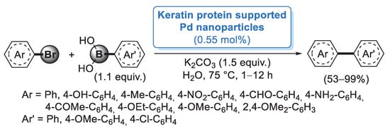 - Ma, H.; Bao, Z.; Han, G.; Yang, N.; Xu, Y.; Yang, Z.; Cao, W.; Ma, Y. Nanoparticulate palladium catalyst stabilized by supported on feather keratin for Suzuki coupling reaction. Chin. J. Catal. 2013, 34, 578–584. [Google Scholar] [CrossRef]