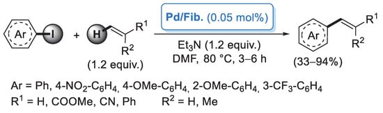 Mizoroki–Heck reaction of aryl iodides with terminal alkenes catalysed by Pd(0)@cellulose, reported in 2008 by Cui et al. [].