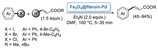 - Nouri Parouch, A.; Koukabi, N.; Abdous, E.; Shobeiri, S.A. Palladium and silk fibroin-containing magnetic nano-biocomposite: A highly efficient heterogeneous nanocatalyst in Heck coupling reactions. Res. Chem. Intermed. 2021, 47, 3165–3177. [Google Scholar] [CrossRef]