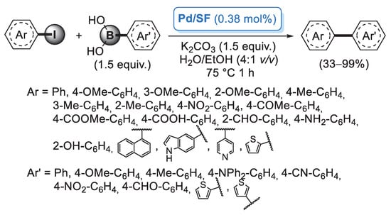 - Mirzaei, H.; Eshghi, H.; Seyedi, S.M. Finely dispersed palladium on silk-fibroin as an efficient and ligand-free catalyst for Heck cross-coupling reaction. Appl. Organomet. Chem. 2019, 33, e5231. [Google Scholar] [CrossRef]