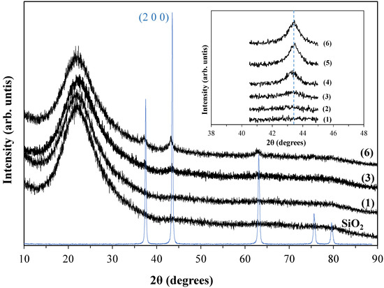 PXRD patterns of SiO2-CH-Ni-oc-X samples, prepared via impregnation of SiO2 with Ni octanoate solution diluted in cyclohexane (see experimental section); X: (1) 1000 ppm Ni, (2) 2500 ppm Ni, (3) 5000 ppm Ni, (4) 10,000 ppm Ni, (5) 15,000 ppm Ni, and (6) 20,000 ppm Ni. The dashed line in the inset graph represents the (2 0 0) reflection of NiO (bunsenite). The pattern of pure NiO (bunsenite structure) is also shown for comparison (blue pattern).