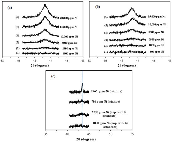 The corresponding short range (41–45° 2θ) pxrd patterns for the other two series of Ni/SiO2 samples, i.e., using aqueous solutions of nickel nitrate or nickel octanoate solutions diluted in hexane, are presented in Figure 3. As in the case of the SiO2-CH-Ni-oc samples, it was difficult to identify the (2 0 0) reflection of NiO in the patterns of the samples with 1000 ppm Ni. This reflection becomes visible for the 2500 ppm Ni sample and its intensity increases with increasing Ni content.