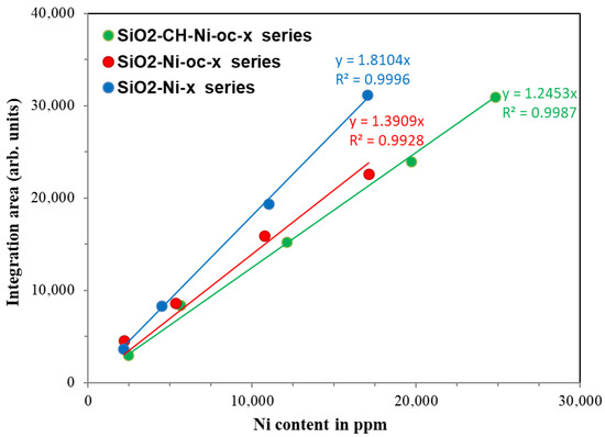 The integrated peak area of the (2 0 0) reflection of NiO (bunsenite) at ~43.3° 2θ was used to plot calibration curves by utilizing the above presented Ni/SiO2 samples as external standards. The range of Ni loading was kept at relatively low values, ca. below 20,000 ppm, in order to be more representative of the Ni content in typical equilibrium catalysts from actual FCC units. As can be seen in Figure 4, linear correlations with coefficient r2 > 0.992 were obtained for all three series of Ni/SiO2 samples, prepared by different procedures. For example, for the SiO2-CH-Ni-oc series of samples, the derived equation was I(200) = 1.2453[Ni] with coefficient r2 = 0.9987; this equation was used for the quantification of NiO (bunsenite) in the commercial FCC catalysts.