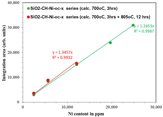 As discussed above, the more intense calcination of the Ni/SiO2 samples at 805 °C for 12 h, being initially calcined at 700 °C for 3 h, had a minor effect on the integrated area of the (2 0 0) reflection. This can be clearly seen from the plots of Figure 5, where the calibration lines of the two sets of samples (mildly and more severely calcined) fall on top of each other.