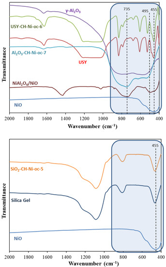 The FTIR spectra of representative Ni-impregnated samples, i.e., Ni/Al2O3, Ni/SiO2 and Ni/USY, are shown in Figure 10; the corresponding spectra of the full mid-IR region are shown in Figure S2 (Supplementary Material). The spectra of the bulk NiO and NiAl2O4/NiO mixed-phase samples are also included for comparison. The spectra of parent γ-Al2O3, amorphous SiO2 and USY zeolite are typical for these types of materials [33,38,39] (in the case of USY, the amount of zeolite in the KBr pellet was relatively high in order to focus/enlarge the region of 400–900 cm−1, leading to poor resolution of the main peak at ~1050 cm−1). The spectrum of bulk NiO exhibits a broad band at ~455 cm−1, and that of mixed NiAl2O4/NiO also contains this band, as well as another two broad bands, i.e., at ~495 and 735 cm−1, which are attributed to NiAl2O4 [40,41]. The spectrum of Al2O3-CH-Ni-oc-7 with 10 wt.% Ni exhibits a clear band at ~735 cm−1 and, to a lesser extent, one at ~495 cm−1. The NiO band at ~455 cm−1 is superimposed by typical SiO2 and USY bands in the spectra of samples SiO2-CH-Ni-oc-5 and USY-CH-Ni-oc-6, respectively, whereas the bands attributed to NiAl2O4 cannot be identified in the spectrum of the Ni/USY sample. Accordingly, bands attributed to NiO or NiAl2O4 phases could not be observed in the Ni-loaded FCC catalysts or the Ecats, due to the relatively low content of Ni and the masking effect of zeolite or silica bands.