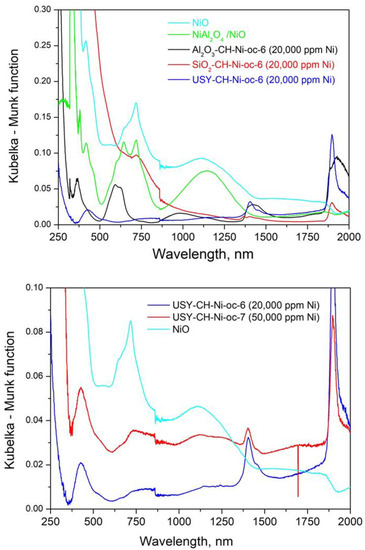 UV-Vis near IR diffuse reflectance spectra of representative Ni-impregnated materials: SiO2-CH-Ni-oc-6 (2 wt.% Ni), Al2O3-CH-Ni-oc-6 (2 wt.% Ni), USY-CH-Ni-oc-6 and 7 (2 and 5 wt.% Ni), and FCC catalysts BLF-CAT-4 and BLB-CAT-4 with 1 wt.% Ni. The spectra of bulk NiO and NiAl2O4/NiO are also included for comparison.
