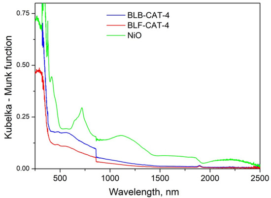 The diffuse reflectance UV-Vis-near IR spectra of representative samples are shown in Figure 11. Pure NiO shows a characteristic strong absorption in the visible region at 718 nm attributed to the 3A2g → a3T1g d-d transition, with a shoulder near 646 nm associated with the weaker 3A2g → a1Eg transition [28,31,42]. The absorption band at 718 nm is also present in the representative Ni/SiO2 sample, namely SiO2-CH-Ni-oc-6 (20,000 ppm Ni), in agreement with pxrd data, where NiO phase was detected. In contrast, in the respective Al2O3 based sample with the same Ni loading, namely Al2O3-CH-Ni-oc-6 (20,000 ppm Ni), the spectrum in the visible region shows a doublet at 590 nm and 625 nm which is attributed to the presence of “isolated” Ni2+ cations, in full agreement with the pxrd results where no NiO phase was detected [28,31]. Notably, in a related USY sample with the same Ni loading, namely USY-CH-Ni-oc-6 (20,000 ppm Ni), these absorption peaks are not detected. However, for a higher Ni-content sample (USY-CH-Ni-oc-7; 50,000 ppm Ni), the absorption peak at 718 nm can be observed. In the near IR region, NiO shows a broad absorption centered at 1119 nm, attributed to the 3A2g → a3T2g d-d transition of Ni2+. This absorption is shifted to 987 nm in the Al2O3-CH-Ni-oc-6 (20,000 ppm Ni), due to the “isolated” nature of Ni2+ species inside the Al2O3 matrix. Representative spectra of Ni-loaded FCC catalysts with 10,000 ppm Ni (BLB-CAT-4 and BLF-CAT-4) are also shown in Figure 11 in comparison with the corresponding spectrum of NiO. In both catalysts, no peak associated with the NiO phase could be detected; however, a relatively broad shoulder centered at 575 nm could be attributed to the presence of “isolated” Ni2+, in accordance with the data presented above for sample Al2O3-CH-Ni-oc-6. Although in the PXRD patterns of both samples, the (2 0 0) reflection of the NiO (bunsenite) structure was clearly visible (Figure 7 and Figure 8), the presence of NiO could not be verified by the UV-vis analysis.