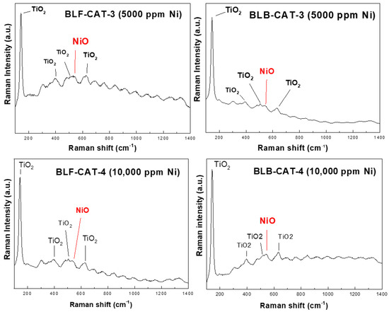 The Raman spectra of representative Ni-loaded FCC catalysts and equilibrium FCC catalysts (Ecats) are shown in Figure 13 and Figure 14, respectively. The characteristic band of NiO can be hardly identified in any Ni-loaded FCC catalysts at ~540–544 cm−1, despite the relatively high Ni content, especially of BLF-CAT-4 and BLB-CAT-4 having 10,000 ppm Ni, compared to Al2O3-CH-Ni-oc-3 (5000 ppm Ni) for which a clearer Raman peak was observed (Figure 12). Furthermore, both BLF-CAT-4 and BLB-CAT-4 contain crystalline NiO (bunsenite) phases, as found by pxrd, at the level of 1391 and 722 ppm Ni (or 1770 and 919 ppm NiO), respectively (Table 2), but still a well-resolved Raman band cannot be observed. One possible reason for this could be the presence of a relatively high content of TiO2 (anatase) whose characteristic Raman bands are at ~140, 395, 510 and 630 cm−1 [48], the one at 510 cm−1 being partially overlapped with the band of NiO. Similarly, the NiO band in the spectra of the Ecat samples B-CAT-5M and B-CAT-6M is very weak since both contain low portions of the NiO phase (191 and 442 ppm NiO, PXRD data, Table 2), despite the relatively high total Ni content of B-CAT-5M (5141 ppm Ni).