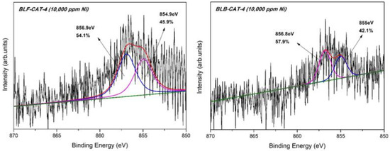 The main XPS peak in the Ni 2p3/2 region of the sample NiAl2O4/NiO can be deconvoluted in two clearly resolved components: one at 855.3 eV assigned to NiO and one at 856.9 eV that is attributed to Ni2+ in NiAl2O4 phases [28,49]. The peaks at 859.8 eV and 863.1 eV correspond to the shake-up satellites of the above peaks, respectively. The Ni 2p XP spectra of the samples Al2O3-CH-Ni-oc-6 (20,000 ppm Ni) and USY-CH-Ni-oc-6 (20,000 ppm Ni) are similar, exhibiting a low intensity peak due to the relatively low total content of Ni, which is deconvoluted in two components: the strongest one is assigned to the NiAl2O4 phase (~70%) and the weakest one is attributed to NiO (~30%) (as can be seen in Figure 15). It is thus obvious that XPS can identify the presence of NiO phases in the Al2O3 and USY impregnated samples, as well as of Ni2+ related to NiAl2O4, at the level of 20,000 ppm total Ni, although no reflections of NiO or NiAl2O4 were observed in their prxd patterns (Figure 6 and Figure S1, respectively). In the case of the FCC catalysts loaded with 10,000 ppm Ni, despite the low signal to noise ratio, a peak in the Ni 2p3/2 region can be also identified and is deconvoluted in two peaks, i.e., ~55% assigned to the NiAl2O4 phase and ~45% to NiO, with no clear differentiation between the boron-containing (BLB-CAT-4) and the boron-free (BLF-CAT-4) samples (Figure 16). Relatively higher NiAl2O4/NiO ratios (ca. ≥80%) have been reported for Ecats with similar total Ni contents [8]. In the case of the Ecats of the present study, no clear signals attributed to NiO or NiAl2O4 phases could be identified.