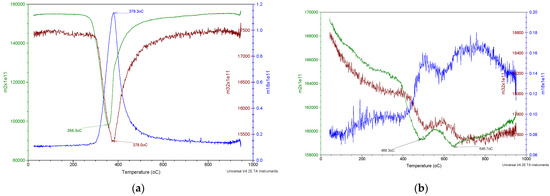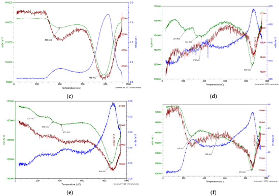 The TPR-H2 profiles of the two representative Ni-loaded lab-deactivated FCC catalysts, i.e., BLF-CAT-4 and BLB-CAT-4, both containing 10,000 ppm Ni, are shown in Figure 21d,e, respectively. For both samples, the TPR profiles exhibit the classical two peaks, a low-temperature very weak broad peak related to the NiO phases and a high temperature strong peak attributed to the reduction of Ni2+ in the NiAl2O4 spinel phase. The high-temp peak is of similar shape and at similar temperature, ca. 860–866 °C, for both catalysts, while a noticeable difference can be seen at the low-temp peak, the peak of BLF-CAT-4 (with max. at ~374 °C) being more intense compared with that of the boron-containing counterpart BLB-CAT-4 (with max. at ~411 °C). This difference is indicative of the presence of higher amount of easily reducible bulk NiO in the former catalyst, in accordance with the PXRD data presented in Table 2. This observation is in agreement with a previous report on the inhibited reducibility of Ni in catalysts from BBT technology [27].