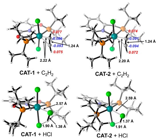 Optimized structures for HCl and C2H2 adsorbed by CAT−1 and CAT−2. Key bond lengths (black numbers) and Hirshfeld charges of C2H2 (red and blue numbers in Italic font) were labeled. Ball colors: green (Cl), gray (C), white (H), blue (N), red (O), orange (P), cyan (Ru).