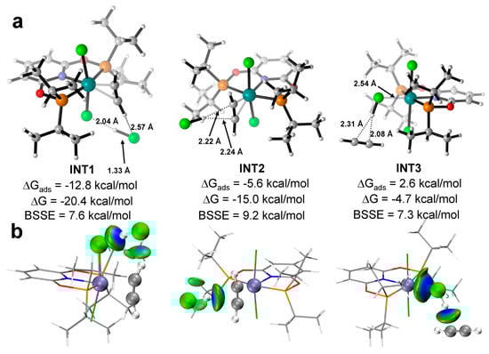 (a) The optimized structure of the co-adsorption state as INT1, INT2 and INT3 with the key bond length (black numbers); (b) The IGM analysis of INT1, INT2 and INT3. Ball colors: green (Cl), gray (C), white (H), blue (N), red (O), brown (P), cyan (Ru).