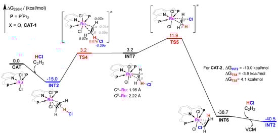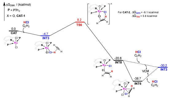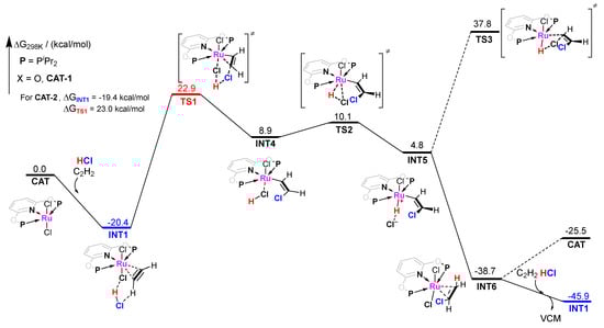 The pathway−1 of CAT−1 catalyzed acetylene hydrochlorination is shown in Figure 4. Firstly, we choose INT1 as the initial adsorption intermediate to investigate possible reaction pathways as INT1 is the dominating intermediate due to its strongest adsportion. In general, the activation by metal complexes of unsaturated hydrocarbons with respect to the nucleophilic attack has been theoretically revealed by Prof. Roald Hoffmann []. Indeed, we have found the chlororuthenation on the C2H2 adsorbed by CAT−1. The free energy barrier (ΔG≠) is quite high from INT1 to TS1, up to 43.3 kcal/mol (42.4 kcal/mol for CAT−2). This is significantly higher than the results reported [,,,,]. Then, the H atom of the original HCl bonds with a Cl− anion of the catalyst to form another HCl molecule. It induced an oxidation addition on the RuII center. The H−Cl covalent bond was broken and a ruthenium-hydride (Ru-H) intermediate was formed. With no energy barrier, the −CH=CHCl group can be rapidly hydrogenated by Ru−H species to form INT6, where the VCM molecule is adsorbed by CAT−1. Finally, VCM is replaced by another C2H2 and HCl pair to form INT1 for the next catalytic cycle. The energy of INT1 (next catalytic cycle) is lower than INT6 (−45.9 kcal/mol vs. −38.7 kcal/mol), which is beneficial for releasing VCM. Note that VCM cannot desorb simultaneously due to its remarkably strong adsorption. Returning CAT−1 will cause an energy increase of 13.2 kcal/mol for the next catalytic cycle. Additionally, we have also considered the chlorination of C2H2 to generate cis-1,2-dichloroethylene (Z-C2H2Cl2). As expected, this side reaction is almost impossible for the very high energy barrier (ΔG≠ = 58.2 kcal/mol). This reflects that the metal center is extremely difficult to be reduced. Therefore, we expect it to well avoid the reduction of RuII and the aggregation of metal particles that causes the deactivation of catalysts in acetylene hydrochlorination.