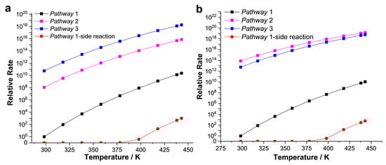 Chemical kinetics studies for catalytic system CAT−1 (a) and CAT−2 (b). Reaction rate constants versus the reaction temperature were carried out via TST calculation. The relative rate unit of CAT−1 and CAT−2 are 5.3 × 10−30 s−1 and 2.3 × 10−29 s−1, respectively.