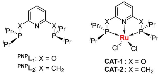 For this study, the ruthenium-based catalyst is investigated for its potential for high-performance-catalysis suggested by Kang et al. []. Beyond ruthenium trichloride RuCl3, the organometallic ruthenium catalysts may have a lower Lewis acidity that benefits acetylene hydrochlorination. Dérien et al. have reported the homogeneous hydrochlorination of substituted alkynes catalyzed by a RuII-complex supported by the pentamethylcyclopentadiene anion (Cp*) and phosphorus ligands at room temperature, showing a highly efficient method with wide applications in organic synthesis []. The mechanistic studies suggest that the RuII center shows π-backdonation to alkynes, which allows the electrophilic addition by HCl with a low energy barrier []. Alternatively, we would like to consider a neutral ligand here, rather than an ionic ligand like cyclopentadiene anion, to discuss the enhancement of ruthenium chloride catalysts. Phosphorus ligands are well matched for the group VIII metals, and the additional chelation effect enhances the stability of the complexes. In this work, the PNP pincer ligands PNPL1 and PNPL2 were considered for the generation of RuII-chloride complexes (Scheme 1).