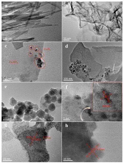 Figure 2 shows the TEM picture of the Pal, Co3O4, Co2SiO4, and Co2SiO4/Co3O4 composites. As shown in Figure 2a, the morphology of Pal is a one-dimensional nanofiber structure with a diameter of about 30–50 nm. After a high concentration of acid treatment, the structure of Pal is destroyed, and the rod-like structure tends to break and assemble into sheets. Figure 2b,f indicates TEM and HRTEM of Co2SiO4. The microstructure of Co2SiO4 is a two-dimensional flake, which may be due to the preservation of the silicon-oxygen tetrahedron structure in the skeleton after the destruction of Pal [12]. After the addition of Co2+, the chain-like structure of the silicon-oxygen tetrahedron regularly grows into two-dimensional cobalt silicate flakes under alkaline hydrothermal conditions. The lattice spacing of the Co2SiO4 is 0.09 nm, corresponding to the (400) crystal plane of Co2SiO4. Figure 2c,g displays TEM and HRTEM of Co2SiO4/Co3O4−1%, respectively. It can be seen that, on the surface of Co2SiO4, the Co3O4 particles have a diameter of about 10 nm. Figure 2d,h shows TEM and HRTEM of Co2SiO4/Co3O4−5%; Co3O4 particles on the surface of Co2SiO4 become more stacked. However, when the amount of Co reaches 10%, it is difficult to distinguish Co2SiO4 and Co3O4, as shown in Figure 2e. The HRTEM images (Figure 2g,h) show that the Co3O4 nanoparticles are uniformly loaded on the surface of the Co2SiO4 2D nanosheets. The lattice spacing of Co3O4 on the surface is 0.32 nm and 0.33 nm, corresponding to the (311) and (400) planes of Co3O4, suggesting the existence of a heterogeneous structure between Co2SiO4 and Co3O4.