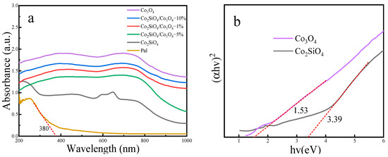 Figure 3a shows the UV-Vis-NIR absorption spectra of the Pal, Co3O4, Co2SiO4, and Co2SiO4/Co3O4 composites. Pal has a weak UV-Vis-NIR absorption edge of about 380 nm, while Co2SiO4 and Co2SiO4/Co3O4 composites obtained by modifying Pal have full-spectrum absorption to achieve the conversion of UV-responsive natural silicate minerals to visible-responsive silicates. Most of the cobalt-based compounds appear as black or dark green, which can absorb the full range of the spectrum and are ideal photothermal materials [8,15]. The band gaps of Co2SiO4 and Co3O4 in Figure 3b are estimated by the formula of (ahv)n/2 = A (hv − Eg); where a, h, v, A, and Eg represent the optical absorption coefficient, Planck constant, optical frequency, a constant, and band gap. The values n = 1 and n = 4 represent the indirect and direct band gap semiconductors, respectively [16,17]. As shown in Figure 3b, the corresponding band gap energies of Co2SiO4 and Co3O4 are estimated to be 3.39 and 1.53 eV, respectively. The narrow band gap is more favorable for capturing the energy of sunlight, thus promoting the generation of e−/h+ pairs [18].