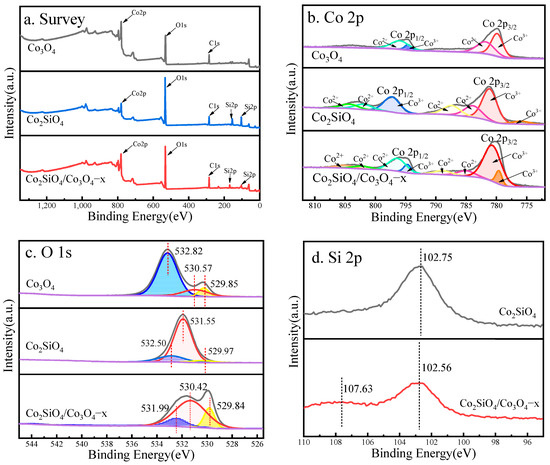 XPS spectra of Co3O4, Co2SiO4, and Co2SiO4/Co3O4−x: (a) survey spectrum, (b) Co 2p, (c) O 1s, and (d) Si 2p.