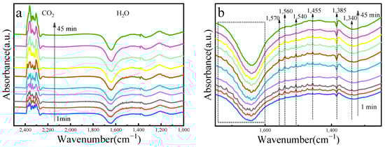(a) In situ DRIFTS spectra for Co2SiO4/Co3O4−x; (b) enlarged in situ DRIFTS spectra at a wavenumber range of 1750−1350 cm−1.