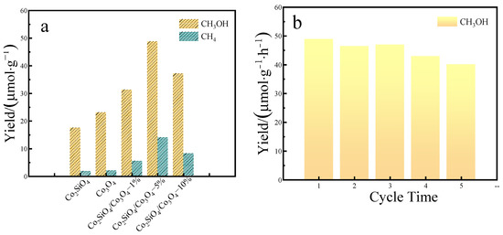 The photothermal catalytic reduction of CO2 performance was performed under solar light. The photothermal catalytic CH3OH generation rate of Co3O4, Co2SiO4, and Co2SiO4/Co3O4−x is shown in Figure 7a. For Co2SiO4/Co3O4−x photocatalysts, the CH3OH generation rate increases with the increase in Co3O4, but excessive Co3O4 may inhibit the photocatalytic reduction activity. Co2SiO4/Co3O4−5% expresses the best CO2 reduction rates of CH3OH and CH4, corresponding to 48.9 and 14.1 μmol·g−1·h−1, which is better than what has been recently reported. After 4 h of sunlight exposure each time, the samples were washed with distilled water for the next test. The samples could maintain considerable photoactivity without significant reduction in activity after five cycling tests (Figure 7b).