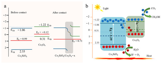 (a) Band structure and transfer route of photogenerated carriers before and after contact between Co3O4 and Co2SiO4; (b) schematic mechanism of photocatalytic conversion of CO2 over Co2SiO4/Co3O4−x heterostructure under sunlight.