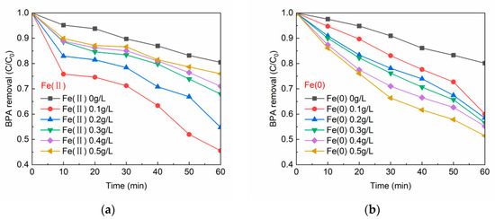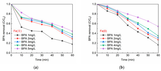 (a) BPA concentration vs. BPA removal by Fe(II); and (b) BPA concentration vs. BPA removal by Fe(0). [PS] = 0.2 mM, [Fe(II)] = 0.1 g/L, [Fe(0)] = 0.1 g/L, T = 20 ± 1 °C, pH = 6.8 ± 0.2.