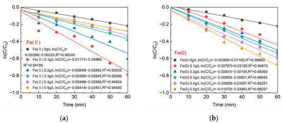 Figure 2a,b develops the kinetic models of BPA degradation by Fe(II)/PS and Fe(0)/PS, respectively. The degradation of BPA at varying dosages of Fe(II) and Fe(0) was in accordance with the pseudo first-order kinetic equations. The correlation coefficients (R2) of the established equations were all above 0.93. In Figure 2a, when Fe(II) was 0.1 g/L, the degradation of BPA obtained the maximum rate of 0.01171 min−1. In Figure 2b, the maximum BPA degradation rate occurred at 0.5 g/L of Fe(0).