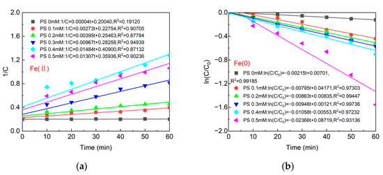Figure 4a demonstrates the kinetic models of BPA degradation by Fe(II)/PS at varying PS concentrations. According to the curves in Figure 4a, 1/Ct exhibited a good linear fit to time in the presence of PS with a high linear fit coefficient (R2 ≥ 0.87132), indicating that the degradation of BPA followed the pseudo-secondary kinetic model well. The maximum reaction rate of 0.01484 (mg/L)−1min−1 was achieved when the PS concentration was 0.4 mM. The curves in Figure 4b revealed that the degradation of BPA at different PS concentrations in Fe(0)/PS conformed to the pseudo first-order kinetic equation. At a PS concentration of 0.5 mM, the degradation rate of BPA could reach 0.02366 (mg/L)−1min−1. BPA showed different degradation kinetics in Fe(II)/PS vs. Fe(0)/PS systems. This may be caused by the difference in the homogeneous catalysis of Fe(II)/PS and the heterogeneous catalysis of Fe(0)/PS.