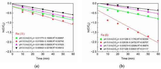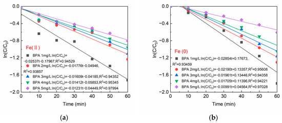 The kinetic equations for the degradation of BPA by the Fe(II)/PS and Fe(0)/PS systems at different pH values are given in Figure 11a,b, respectively. The BPA degradation curves satisfied the pseudo first-order kinetic equation (R2 ≥ 0.89857) except for the degradation of BPA by the Fe(0)/PS system at pH 9. The maximum kinetic constant (0.02818 (mg/L)−1min−1) appeared in the Fe(0)/PS system at pH 5.