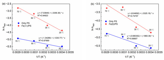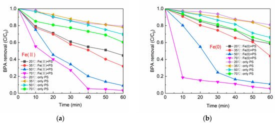 Temperature is an important factor affecting the rate of chemical reactions. The effect of varying temperatures on BPA removal in systems Fe(II)/PS and Fe(0)/PS are given in Figure 7a,b, respectively. With only PS in the system, the degradation rates of BPA in Figure 7a,b all increased with the temperature rising. The degradation of BPA via PS was close to 40% at the temperature of 70 °C in both Figures. According to previous studies [41,42,43], PS could be activated by heat to form SO4•− (Equation (7)), which in turn improved the degradation efficiency of organic matter. The elevation in temperature could increase the energy of the reaction system. As this energy exceeded the peroxide bond energy of PS, the peroxide bond broke and SO4•− was formed. When both Fe(II) (or Fe(0)) and PS were present in the BPA solution, Fe(II) (or Fe(0)) could activate PS together with the heat energy brought by the high temperature and produce more SO4•−. Thus, at 70 °C, the removal of BPA reached 96.7% by Fe(II)/PS and reached 94.5% by Fe(0)/PS.