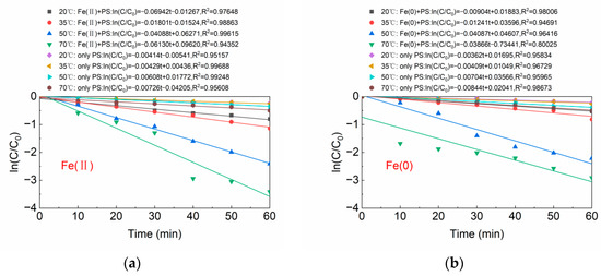 Figure 8a,b shows the kinetic models of BPA degradation at varying temperature conditions in the Fe(II)/PS system and Fe(0)/PS system, respectively. The pseudo first-order reaction kinetic equations (R2 ≥ 0.80025) were applied to the degradation of BPA at different temperatures in both Figure 8a,b. The degradation rates of BPA by the Fe(II)/PS system and Fe(0)/PS system at 70 °C reached 0.06130 (mg/L)−1min−1 and 0.03866 (mg/L)−1min−1, respectively.