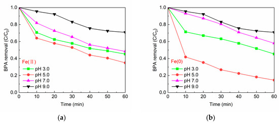 The initial pH value of solution is an important factor affecting the chemical reaction. Therefore, the degradation of BPA by two systems under different initial pH values was studied. Only the initial pH value of the solution was adjusted, and the pH value in the whole reaction process was not controlled. Figure 10a,b reflected the effect of changing pH values on the degradation of BPA by Fe(II)/PS and Fe(0)/PS. It was found that in Figure 10a,b, pH 5.0 was the optimal condition for both systems. The degradation of BPA was poor in both systems under alkaline conditions. On the one hand, the oxidation capacity of the systems was reduced due to the reaction of sulfate radicals converted to hydroxyl radicals in the presence of hydroxide (Equation (9)) [44]. On the other hand, the formation of Fe(OH)3 could lead to the inhibition of the catalytic reaction (Equation (10)). In the practical application of these two systems, if 5.0 is set as the best pH value, it needs to consume chemical regulators. In addition, the requirements for the corrosion resistance of pipelines have also been improved. One suggestion is that under the condition that partial removal of BPA is allowed in the pretreatment stage, it can be considered to degrade BPA at pH 6.5.