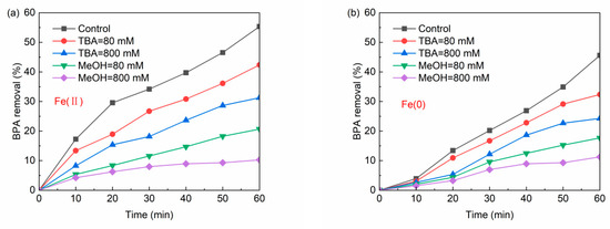 In order to identify which type of free radicals appeared in the reaction, methanol (Me(OH)) and tert-Butyl alcohol (TBA) were used as extinguishing agents to investigate the degree of inhibition of the chemical reaction. MeOH is an effective scavenger for both •OH (k = 9.7 × 108 M−1 s−1) and SO4•− (k = 1.1 × 107 M−1 s−1), while TBA is an effective scavenger for •OH (k = 6.0 × 108 M−1 s−1), but not for SO4•− (k = 9.1 × 105 M−1 s−1) [45]. Figure 12a,b exhibits BPA degradation in the presence of either MeOH or TBA in the Fe(II)/PS and Fe(0)/PS systems, respectively. Both MeOH and TBA were found to inhibit BPA degradation in both systems. The inhibitory effect of Me(OH) on the two systems was greater than that of TBA. It suggested that both SO4•− and •OH played roles in the oxidation of BPA in the two systems.