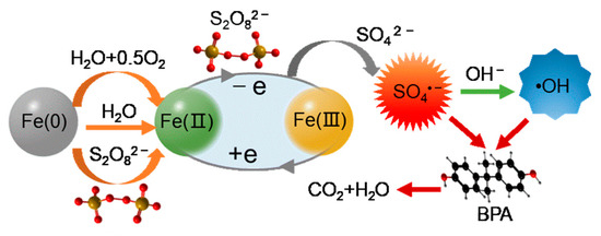 The removal of recalcitrant organic matter (including endocrine disruptor BPA) by advanced oxidation processes (AOPs) has become one of the hot spots in water treatment research. The AOPs mainly use highly oxidizing free radicals generated in situ to degrade organic matters, such as hydroxyl radicals (•OH, E0 = 1.9−2.7) and sulfate radicals (SO4•−, E0 = 2.5−3.1 V) [10,11]. Compared with hydroxyl radicals, sulfate radicals have a higher oxidation capacity for organic substances and are more adaptable to reaction conditions. Therefore, sulfate radical oxidation is more advantageous than the conventional hydroxyl radical oxidation in the treatment of recalcitrant organics [12]. Oxidants (hydrogen peroxide [13], ozone [14], persulfate (PS) [15], and peroxymonosulfate [16]) can be used as precursors to generate free radicals with the help of all kinds of energies or materials [17]. The means of activation can be ultraviolet light (UV) [18], heat [19], microwaves (MW) [20], ultrasound (US) [21], heavy metals (Fe [22], Co [23], Cu [24], Mn [25]), and carbon materials [26,27]. Among the four oxidants mentioned above, PS is favored by researchers because of its stable nature and ease of transport and storage [28]. PS alone (S2O82−, E0 = 2.01 V) has a weak ability to directly oxidize organic matters, while it can be activated to produce free radicals to acquire better performance toward organics degradation [29]. The molecule of PS contains an O—O bond (140 kJ/mol, 1.497 Å), which can be broken to form sulfate radicals at external energies (UV, US, MW, and heat) above the O—O bond energy [30]. In addition, PS can also undergo redox reaction with transition metals to form sulfate radicals [31]. As iron is a common transition metal that is abundant on earth, inexpensive, and non-toxic, it is considered as a benign catalyst used in AOPs [32]. For example, divalent iron (Fe(II)) could catalyze PS to generate sulfate radicals [33]. In addition, powdered iron (Fe(0)) has also been used to activate PS in removing organic matter [34].