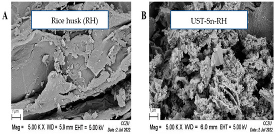 Scanning Electron Microscopy (SEM) images of rice husk (RH) (A) and chemocatalyst UST-Sn-RH (B).