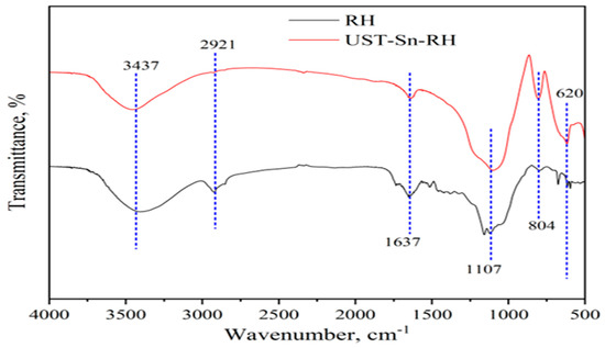 It was observed that UST-Sn-RH surface became much looser after raw material RH was used as a carrier for preparing solid acid (Figure 2A,B), verifying that original surface structure of RH was dramatically destroyed and became looser after a series of treatment (ultrasonic, ethanol, NaOH, H2SO4, etc.) [31]. FT-IR (Figure 3) showed that UST-Sn-RH exhibited diverse properties from raw material RH. The peak about 3437 cm−1 is assigned to the vibration of O-H stretching. The peak near 2921 cm−1 is ascribed to -CH which is prevalent to cellulose, and it was observed to be substantially weakened because of the removal of cellulose [32]. The preparation process of solid acid UST-Sn-RH may reshape the RH structure. As a result, the cellulose and some other structures would be cracked to some extent. The peak about 1637 cm−1 is attributed to aromatic skeletal vibration [33]. The peak near 1107 cm−1 is related to the stretching vibration of C-O and S=O [34]. The peak near 804 cm−1 is associated with carbonate [35]. The peak near 620 cm−1 is assigned the loaded SnO2 [30,33]. Overall, FT-IR verified that Brönsted/Lewis acid sites had been successfully loaded on UST-Sn-RH.