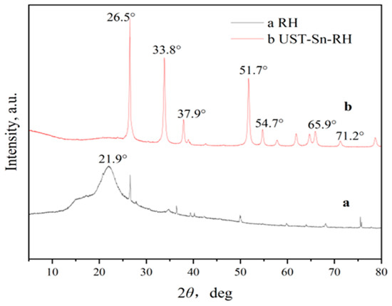 XRD technique can be employed to test the crystal structure of UST-Sn-RH. As revealed in XRD images (Figure 4), a broad diffraction peak at 21.9° ranging from 10° to 30° indicates the existence of amorphous structure in RH. Distinct from raw RH, the narrow diffraction peaks observed at 26.5°, 33.8°, 37.9°, 51.7°, 54.7°, 65.9° and 71.2° are attributed to the crystal structure of SnO2 loaded on UST-Sn-RH, which was consistent with the former report on SnO2 [36].