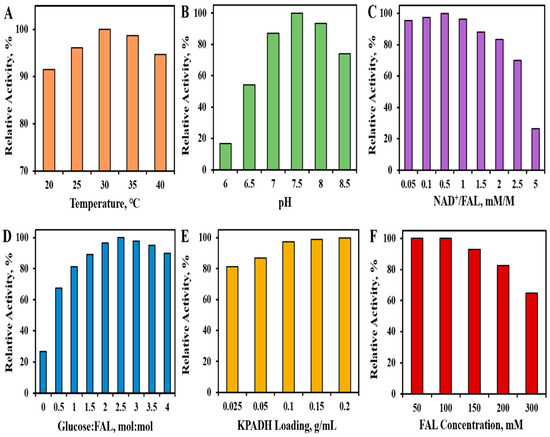 (A) Effects of bioreduction temperature (20–40 °C) on the FAL-reducing activity (FAL 100 mM, pH 7.5, NAD+/FAL 0.5:1 (mmol:mol), glucose/FAL 2.5:1 (mol:mol), KPADH cell wet weight 0.1 g/mL); (B) effects of bioreduction pH (100 mM KH2PO4-K2HPO4 buffer, pH 6.0–8.5) on the FAL-reducing activity (FAL 100 mM, 30 °C, NAD+/FAL 0.5:1 (mmol:mol), glucose/FAL 2.5:1 (mol:mol), KPADH cell wet weight 0.1 g/mL); (C) effects of NAD+ load (NAD+ to FAL molar ratio, 0.05–5:1, mmol: mol) on the FAL-reducing activity (FAL 100 mM, 30 °C, pH 7.5, glucose/FAL 2.5:1 (mol:mol), KPADH cell wet weight 0.1 g/mL); (D) effects of glucose load (glucose to FAL molar ratio, 0–4:1 mol: mol) on the FAL-reducing activity (FAL 100 mM, 30 °C, pH 7.5, NAD+/FAL 0.5:1 (mmol:mol), KPADH cell wet weight 0.025–0.2 g/mL); (E) effects of cell biocatalyst load (0.025–0.20 g/mL) on the FAL-reducing activity (FAL 100 mM, 30 °C, pH 7.5, NAD+/FAL 0.5:1 (mmol:mol), glucose/FAL 2.5:1 (mol:mol)); (F) effects of FAL concentration (50–300 mM) on the FAL-reducing activity (30 °C, pH 7.5, NAD+/FAL 0.5:1 (mmol:mol), glucose/FAL 2.5:1 (mol:mol), KPADH cell wet weight 0.1 g/mL).