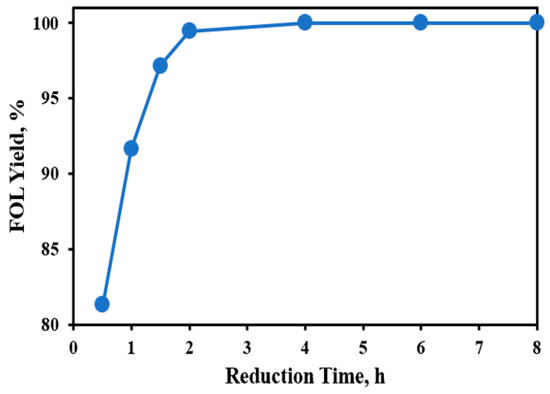 In this study, the biological reduction was carried out under optimized reaction conditions using KPADH cell as the biocatalyst, and 100 mM of FAL was efficiently converted to FOL in the analytical yield of 100%. Using S. cerevisiae NL22 as the biocatalyst, the maximal FOL yield of 98% was given at 30 °C in the presence of 62 mM FAL within 8 h [47]. In the conversion by B. coagulans NL01, about 98 mM FOL was synthesized from FAL in 24 h with the yield of 92% [48]. SF21 cells transformed CCB-derived FAL (74.6 mM) to FOL with a conversion of 95.8% at 40 °C [23]. Of FAL, 94.8% (66.0 mM) was reduced to FOL using CCZU-A13 cell as biocatalyst at 30 °C in 2 h [15]. Monitoring time course of FAL-reducing reaction is critical to learn about the biological reaction process. As depicted in Figure 8, 97.2% of FAL (100 mM) was transformed into FOL in 90 min. When the biological reaction was carried out for 2 h, the FOL yield reached nearly 100%. As a result, it was obviously that KPADH whole cells had excellent bioreduction activity towards FAL in the aqueous phase. This established bioreduction strategy had potential application in the production of FOL.