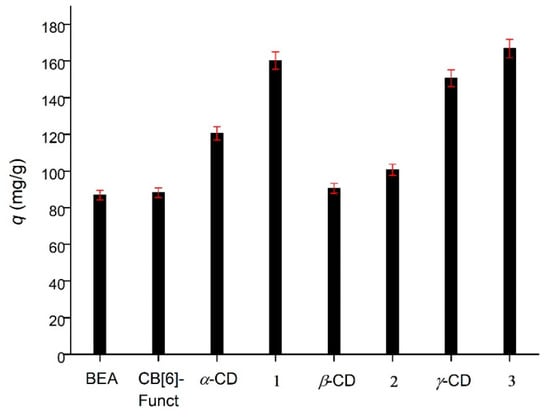 Figure 1 reports the comparison of the investigated CDs, the BEA zeolite (Zeolyst Int., CP 811-300 SiO2/Al2O3 = 300, Brunauer–Emmett–Teller (BET) surface area 280 m2/g), and our previous studied material based on cucurbit[6]uril (CB[6]-Funct) [8] (surface area 277 m2/g). Interestingly, the functionalization of the α-CD exhibited the highest increase in the CO2 capture (from q = 120.6 to q = 160.2), where q is the amount of carbon dioxide adsorbed calculated by the Equation (1),