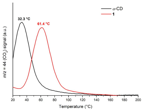 Indeed, from the CO2-TPD (temperature-programmed desorption) curve (Figure 2), it is possible to note that material 1 increased the desorption temperature by about 30 °C, pointing to a stronger interaction with CO2 in the linear adsorptive form [28] compared to the unfunctionalized CD. These peaks could not be correlated to the thermal degradation of the α-CD structures, which were stable up to 300 °C [29].