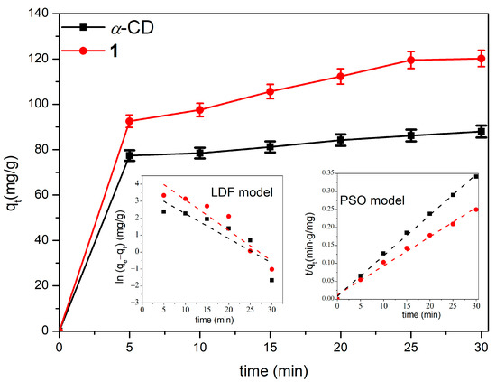 CO2 capture kinetics on the samples of α-CD and 1. In the insets, the experimental data (points) and the fit (dashed lines) with the LDF and the PSO models are shown.