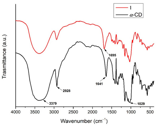 Focusing on α-CD, we performed infrared spectroscopy (IR) measurements of compound 1 to further validate that functionalization had occurred and to verify the CO2 adsorption process. In Figure 4, we compare the IR spectra of α-CD and 1, where typical vibrations were present. In particular, the absorption peaks at 3379, 2928, 1641, and 1029 cm−1 were attributed to O–H, C–H, C–C, and C–O–C stretching vibration of CD [38], respectively (black curve). In addition to these peaks, compound 1 (red curve) showed an absorption peak at 1695 cm−1, which could be attributed to the vibration of the C=O (amide) inserted with the functionalization [39].
