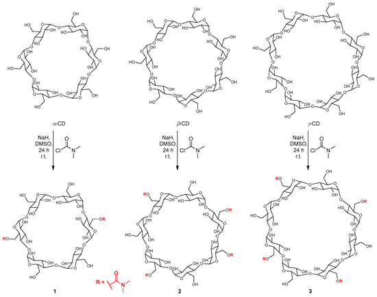 All the required chemicals were purchased from Merck: α-CD, β-CD, and γ-CD (>98.0%), dimethylcarbamoyl chloride (98%), sodium hydride in mineral oil (60%), acetone, and dimethyl sulfoxide anhydrous (DMSO) 99.9%. Precoated aluminum sheets (silica gel 60 F254, Merck) were used for thin-layer chromatography (TLC). 1H- and 13C-NMR spectra were recorded at 300 K on Varian UNITY Inova using DMSO-d6 as the solvent at 500 MHz for 1H-NMR and 125 MHz for 13C-NMR. 13C spectra were 1H-decoupled, and the APT pulse sequence determined the multiplicities. FTIR analyses in the 4000–400 cm−1 region were obtained using an FTIR System 2000 (Perkin-Elmer, Waltham, MA, USA) with KBr as the medium. MALDI mass spectra were acquired in reflector mode using a 4800 MALDI TOF/TOF™ Analyzer (Applied Biosystem, Framingham, MA, USA), equipped with a Nd:YAG laser (wavelength of 355 nm) and working in positive-ion mode.